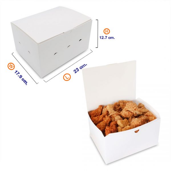 Made from 270-340 gsm paper, coated for food contact, oil and leak-resistant. The paper is imported, and the box maintains its shape well. The box is easy to fold and close, keeping food clean and safe. After use, it can be folded and disposed of without wasting space. The production process is safe for consumers and the environment.